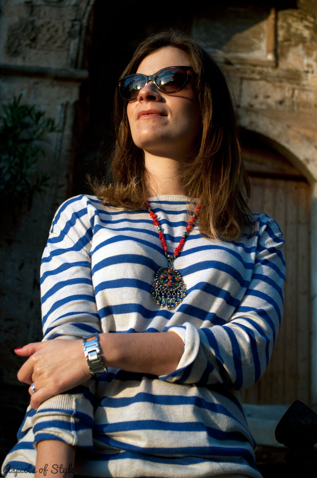 My outfit consisted of a striped top from H&M, skinny jeans from Zara, my beloved necklace from Algeria (which broke after the shoot 🙁 ), one of my many Folli Follie bags and Vogue sunglasses. My nail polish is Downtown Red by Maybelline.