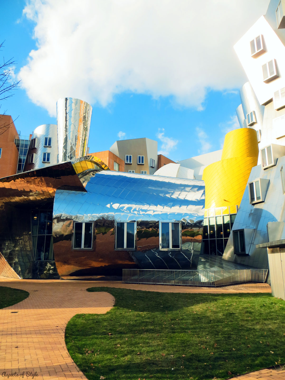 My favorite architect is Frank Gehry and my dream is to travel to Bilbao with the sole purpose of seeing the Guggenheim museum (I care more for the building than the exhibits, mind you) and I’m super happy that these past days I got to see a “clone” of the museum, aka the Walt Disney Music Hall in LA (post will definitely follow). For the time being I present you the Ray and Maria Stata Center in Cambridge, MA which is part of the Massachusetts Institute of Technology (affectionately known as MIT). Last year on this exact date we learned that we were coming in Boston and I was thrilled for many reasons, one of them being that I would get to see a building by Frank Gehry! Score!