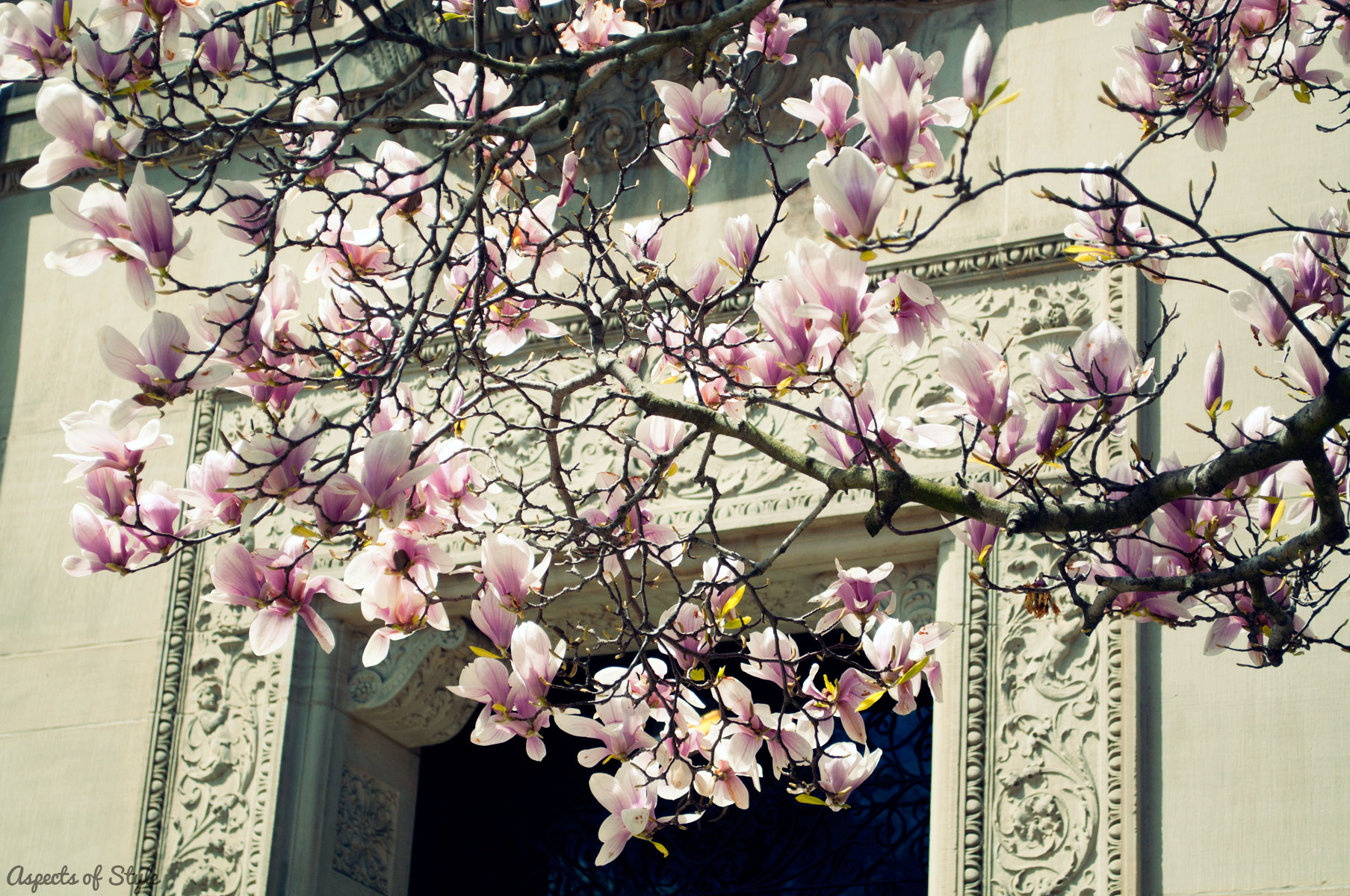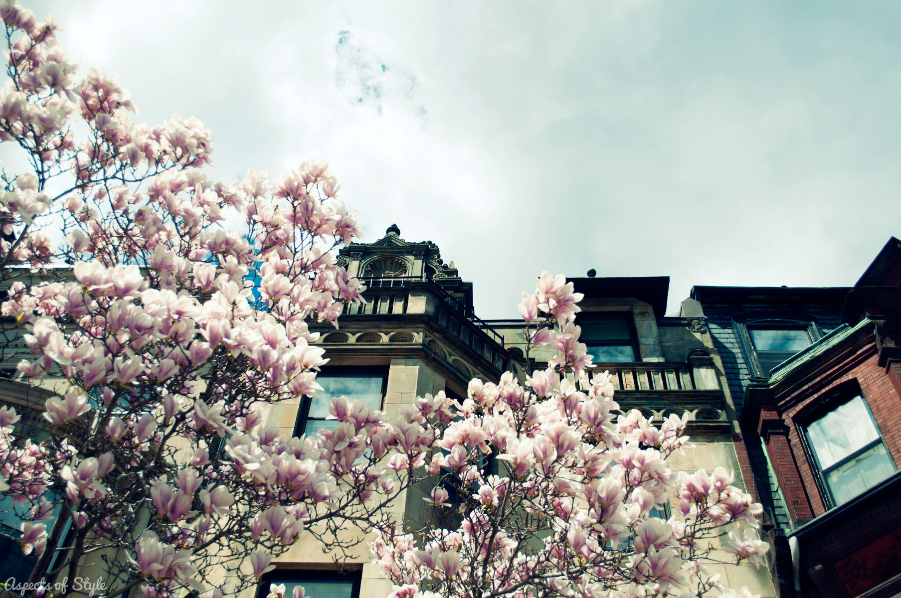 Magnolias are in full bloom in Boston and specifically on Commonwealth Avenue, which is one of my favorite streets in Boston. I love the intricate architectural details combined with the beautiful magnolia blossoms.