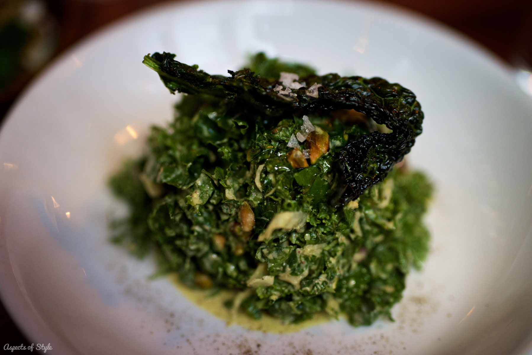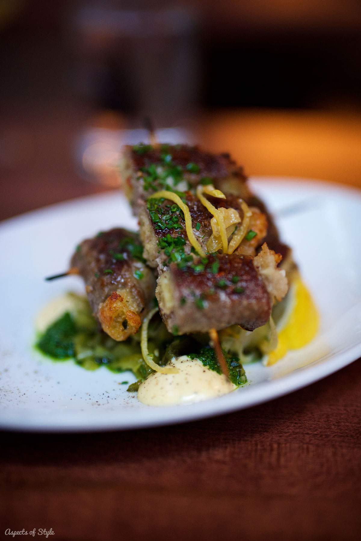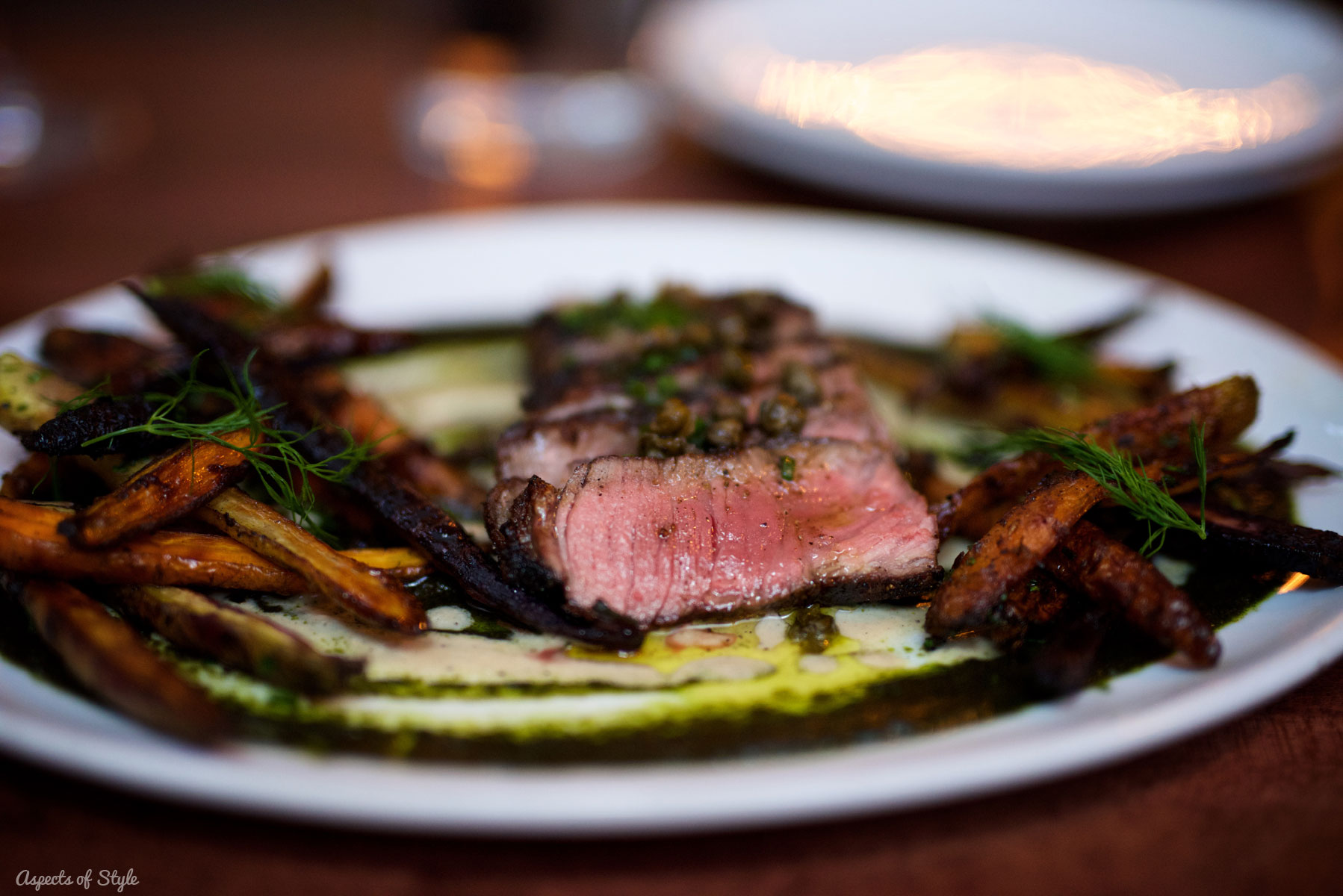 We kicked off dinner with cocktails.  Then we tried the kale salad with creamy pistachio dressing, which was delicious, but rather heavy on the pepper. As I said, I don’t remember the name of my main course, but essentially it was made from rolled minced beef with filling passed through a skewer. My husband had the Creekstone Farms New York strip with grilled carrots, burnt scallion and tonnato. Both dishes where delicious!
