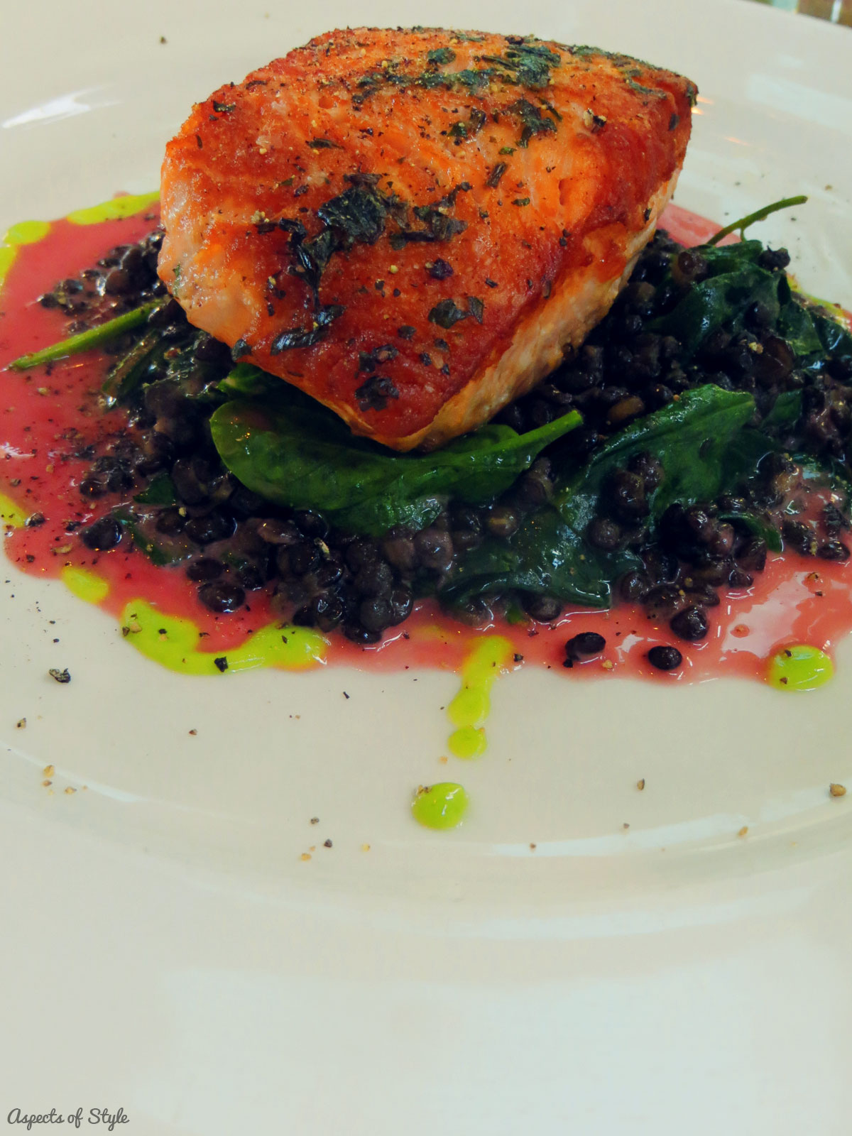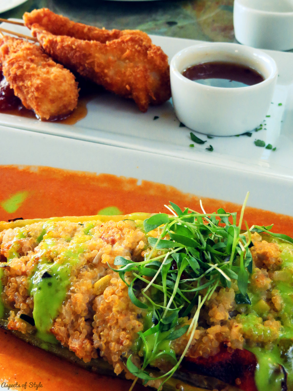 Before going to California I had read about Geoffreyâs at Christineâs blog so I suggested it. We booked a table through Open Table (I love this app) and made our way to the restaurant! We ordered 2 appetizers and 2 main courses split among 4 persons. For the first time I tried coconut fried shrimp and I was mind blown! I’ve already researched recipes and want to try at home! The other dishes featured are: quinoa stuffed pepper and herb crusted salmon.
