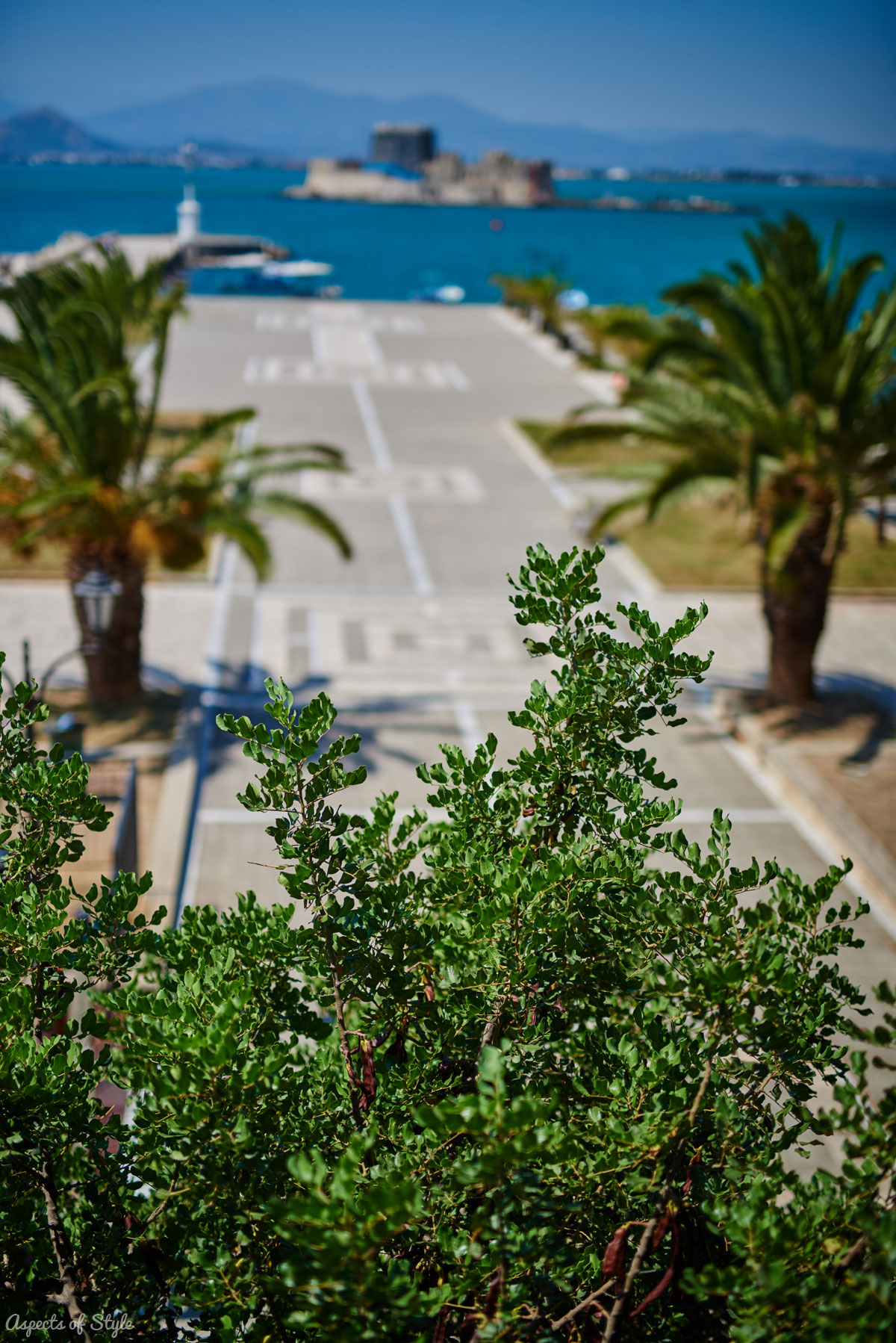 Palamidi should be your first port of call when arriving in the city. Itâs better to drive up there and walk around the fortress grounds before it gets too hot during the summer months. From here you have a wonderful view over the city and of course Bourtzi castle in the middle of Nafplioâs harbor.