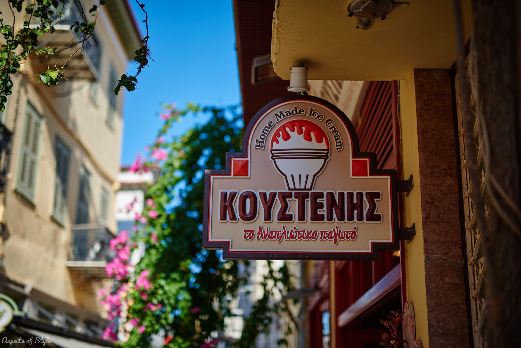 Every time I visit, I like to wander around the cobblestone streets of Nafplio’s old town. These streets are full of cute little shops, cafes and restaurants. On Vasileos Konstantinou street that connects Trion Navarchon square with Syntagma square (old town’s central square) you will find my favorite ice cream parlor Koustenis which is a local brand and was recommended to me by Vasia who lives in the city, so she knows best! Then on Staikopoulou street behind Syntagma square you are going to find a couple of restaurants/taverns as well. My favorite one there is Vassilis (and I keep going back again and again)!
