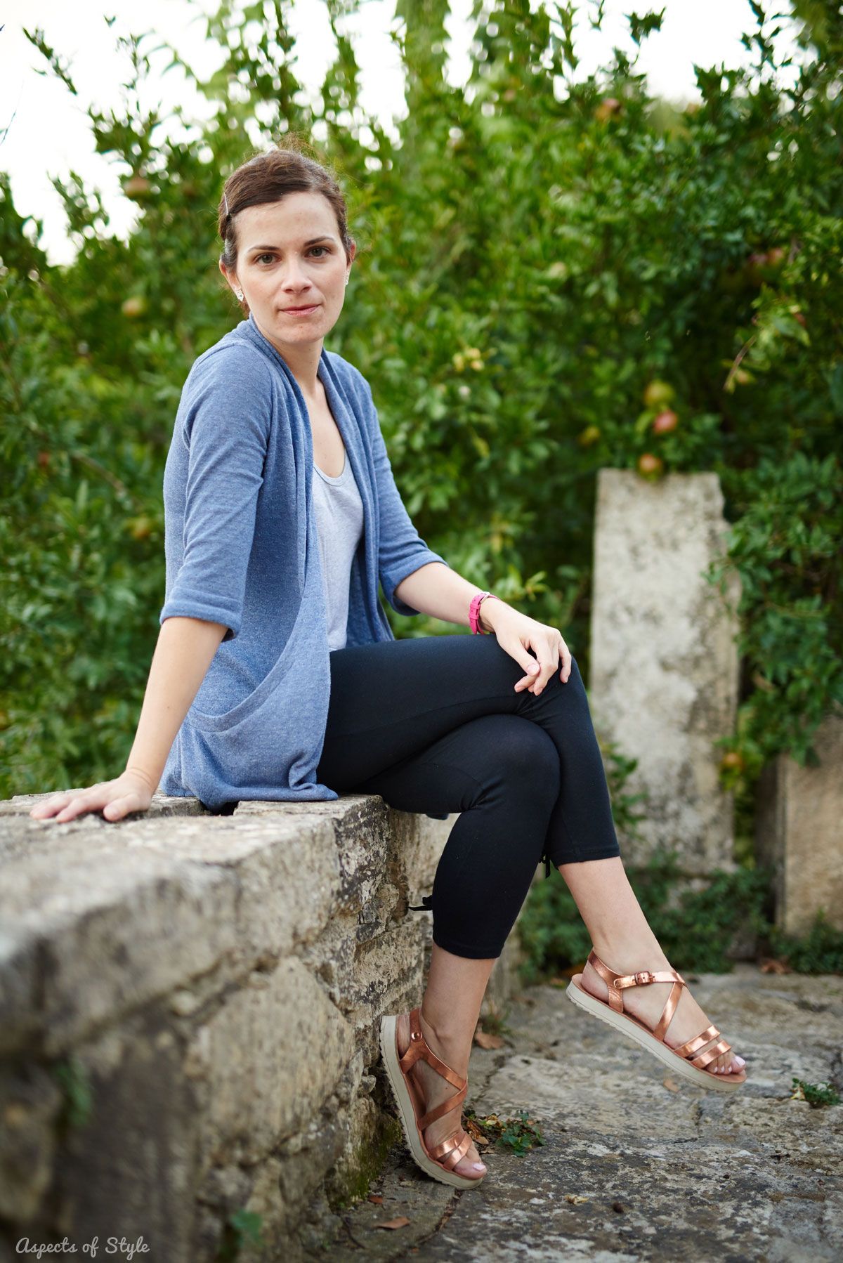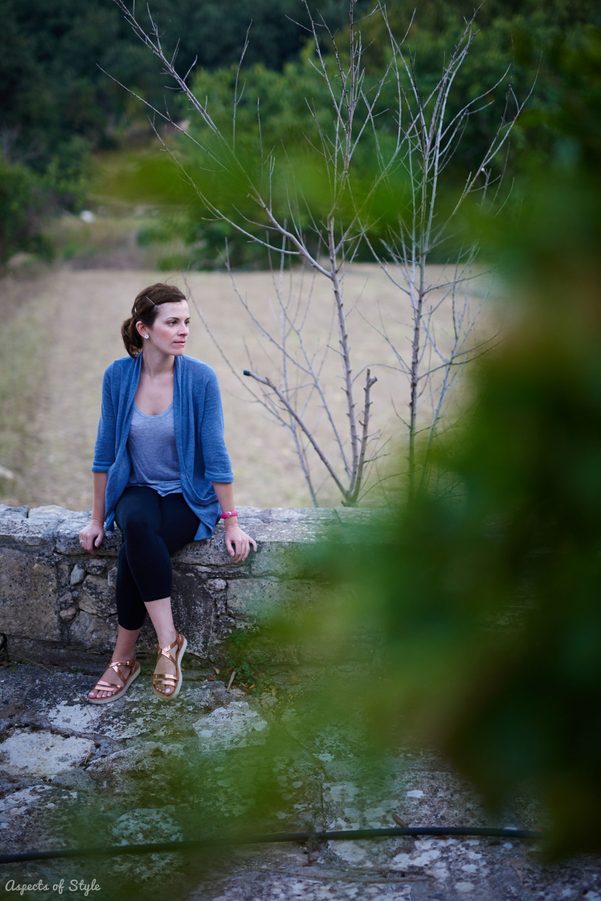For leisure walks comfort is the key for me! The outfit I chose this time consisted of leggings (these are from Guess), my trusty Zara tank top and a cardigan! Shoe wise I went for my comfortable pair of Fanstasy Sandals (also styled with a tropical print dress). And no need for a bag since the cardigan has pockets! This outfit works well as a transitional one to fall as it contains both summer (tank top, sandals) and fall (cardigan, leggings) elements!