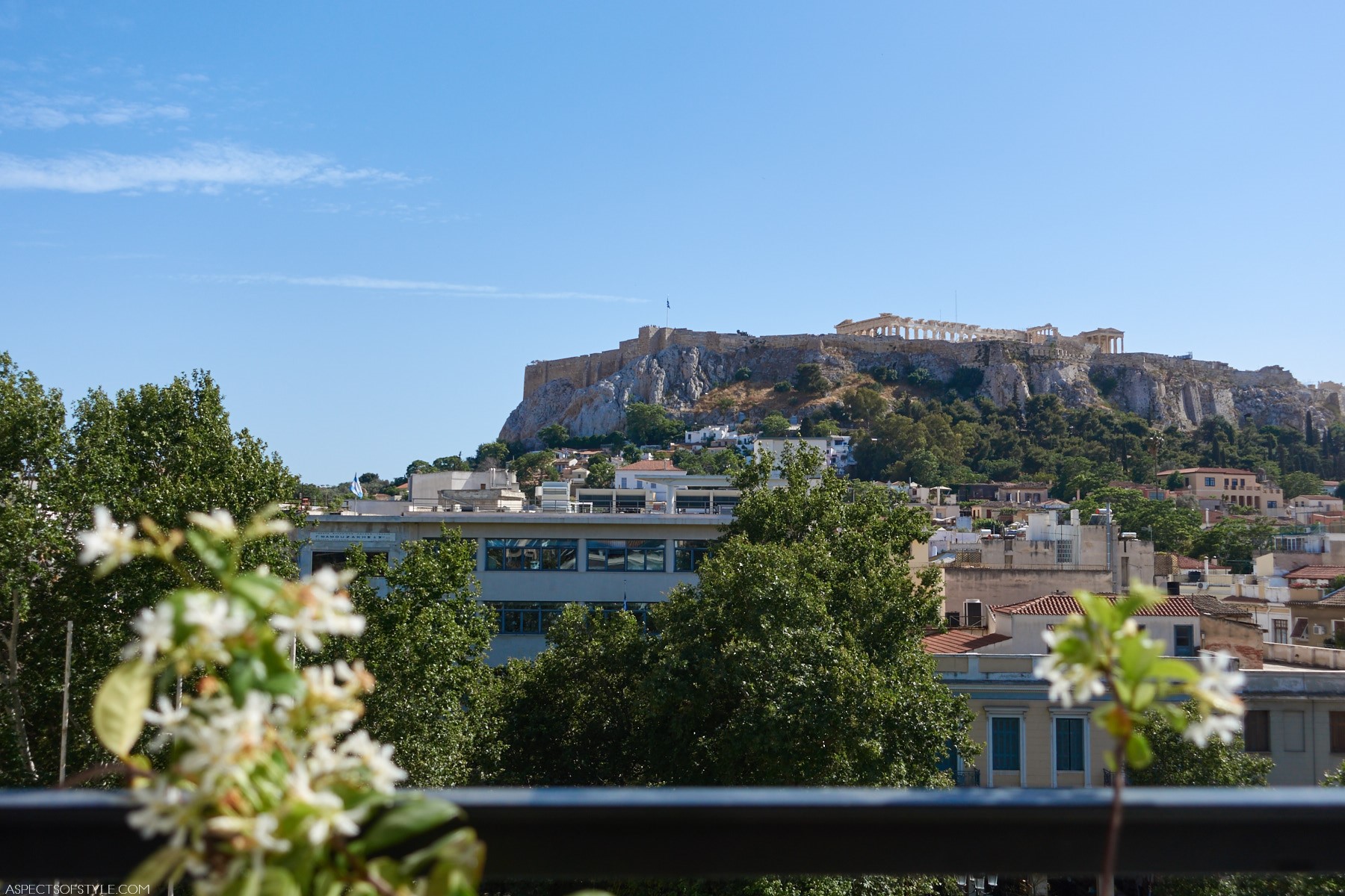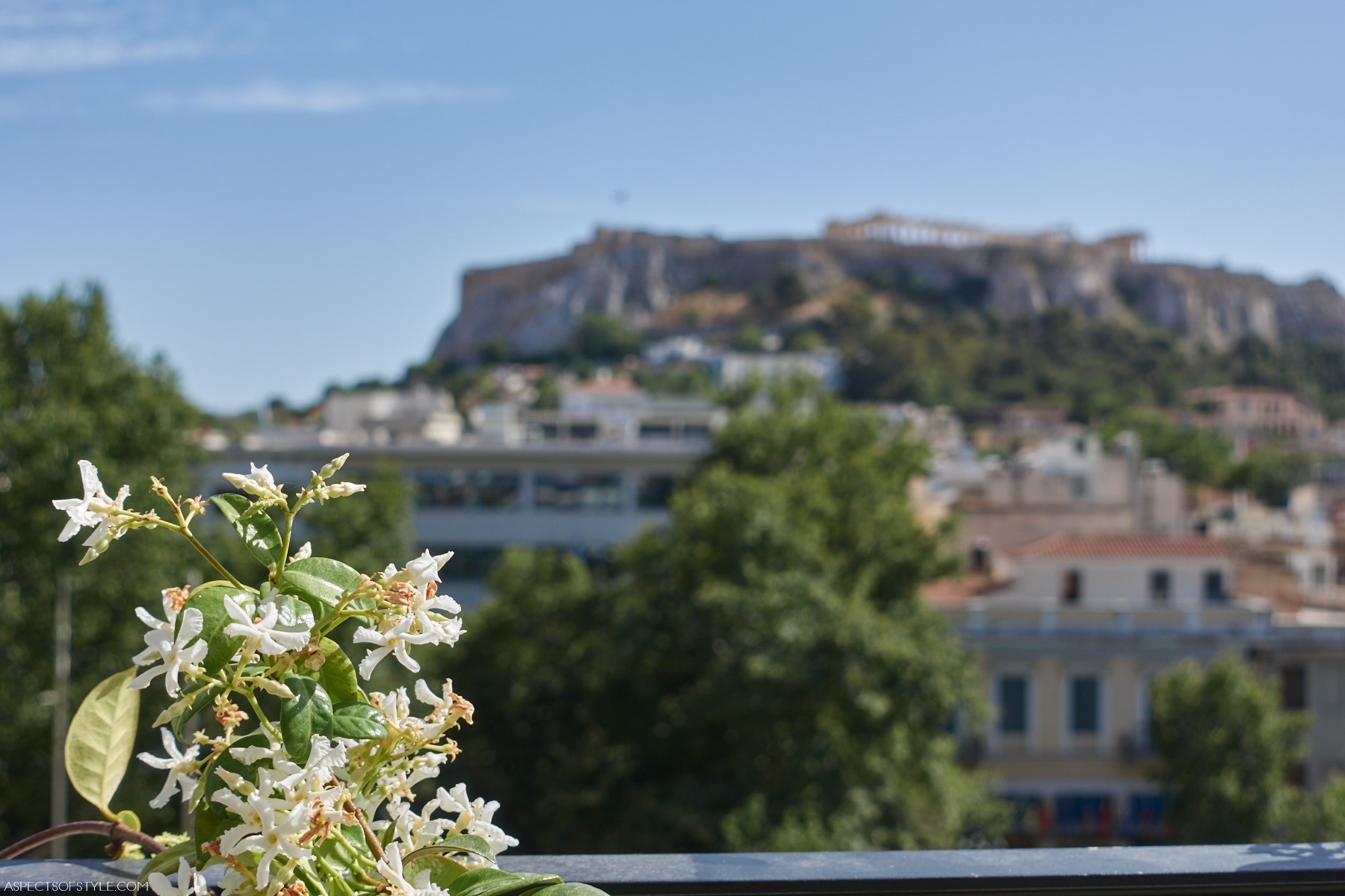 The Zillers is centrally located at Athens’ Cathedral square (Plateia Mitropoleos), but you must be careful not to miss the white door that leads to the hotel and roof garden! I visited the roof top cafe/restaurant last Friday and was lucky enough to snap a seat by the railing, so I had the perfect view over the square and of course towards the Acropolis. The terrace is minimal and modern. Both the side walls are covered with plants (pictured below) giving off this garden feeling!