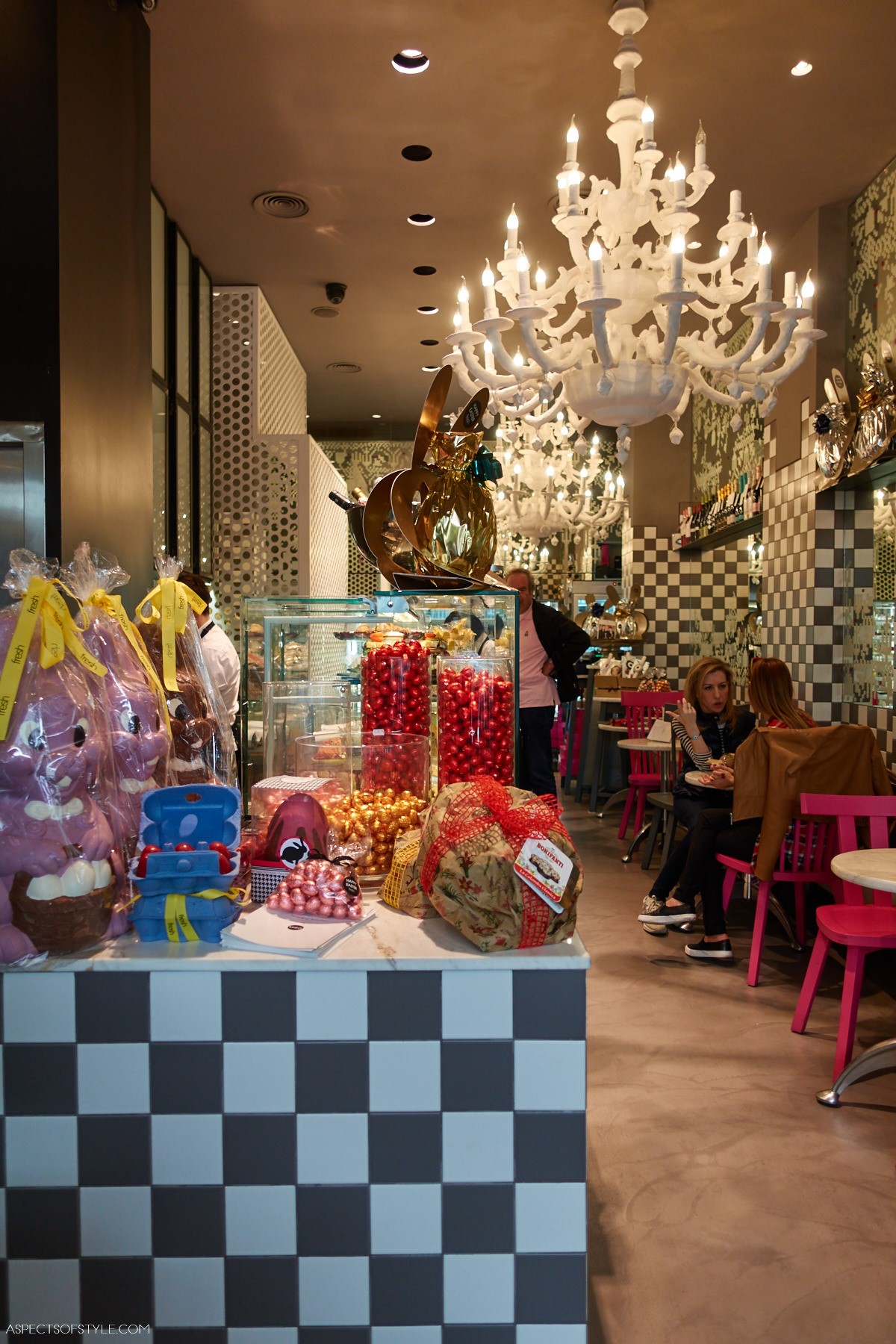 The space is designed Italian architect Paola Navone and features black and white tiles and large chandeliers. There are not many tables inside the store, but outdoor seating is also available, with heaters and blankets provided for the cold months!