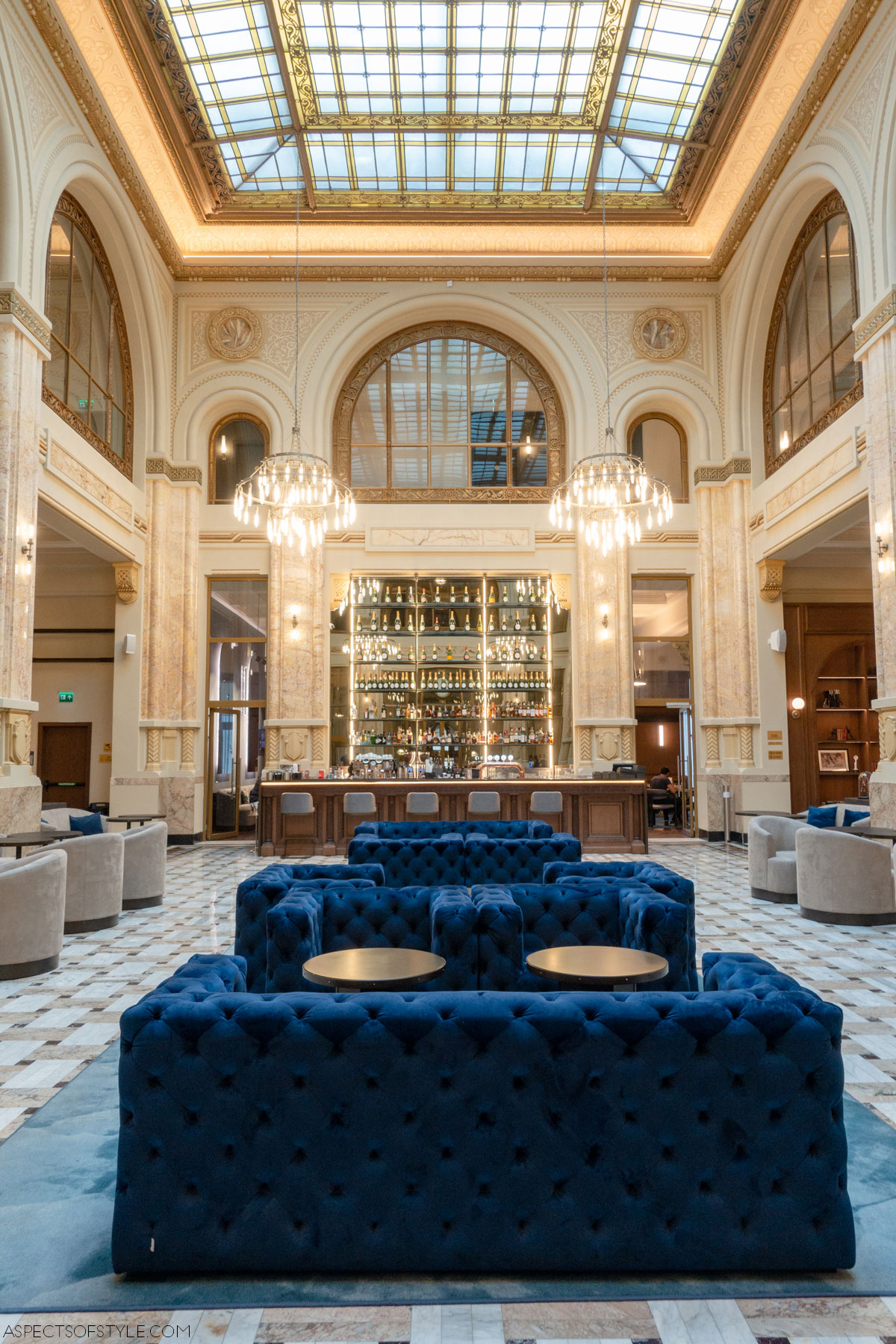 We stayed at The Marmorosch Bucharest using Marriott Bonvoy points. The building used to house the Marmorosch – Blank bank until 1949. The bank was one of the most important Romanian banking institutions of the early 20th century. That explains the grandeur of the building and especially the central hall which houses the bar/lounge/restaurant.