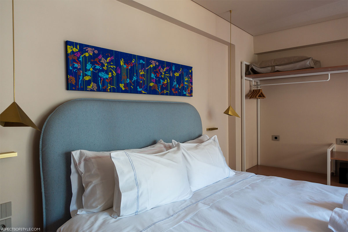 The hotel offers three different room decoration concepts. One features vintage postcards of Athens on the walls, another incorporates glass blue “evil eyes” (my personal favorite), and the third draws inspiration from Karagiozis, the traditional shadow-puppet theater character. It’s a bold and creative option if you’re wondering where to stay in Athens with a strong design identity.