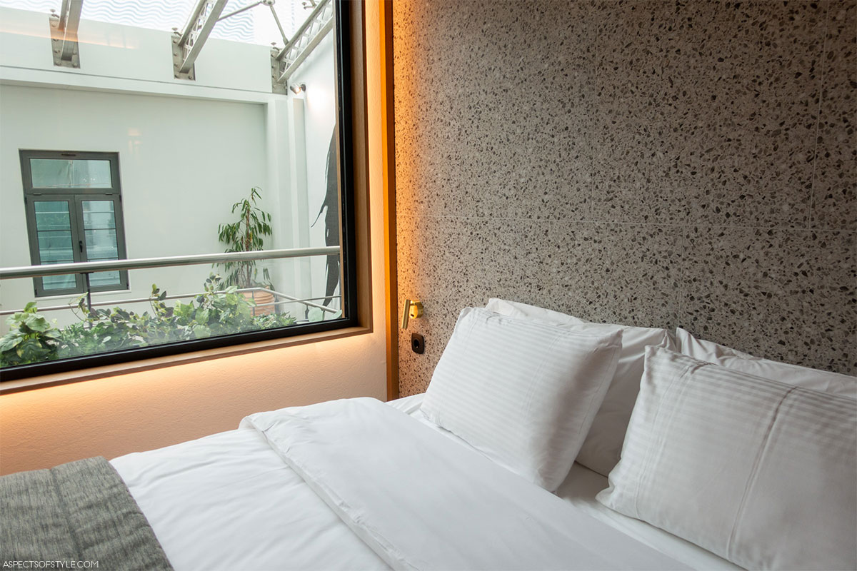 The hotel features more than 30 rooms across four floors, available in five different sizes. During my visit, we saw two types — one overlooking the atrium and another facing the back of the building. The aesthetic is minimal and functional, with breeze block partitions (a nod to 1960s architecture) subtly dividing spaces.